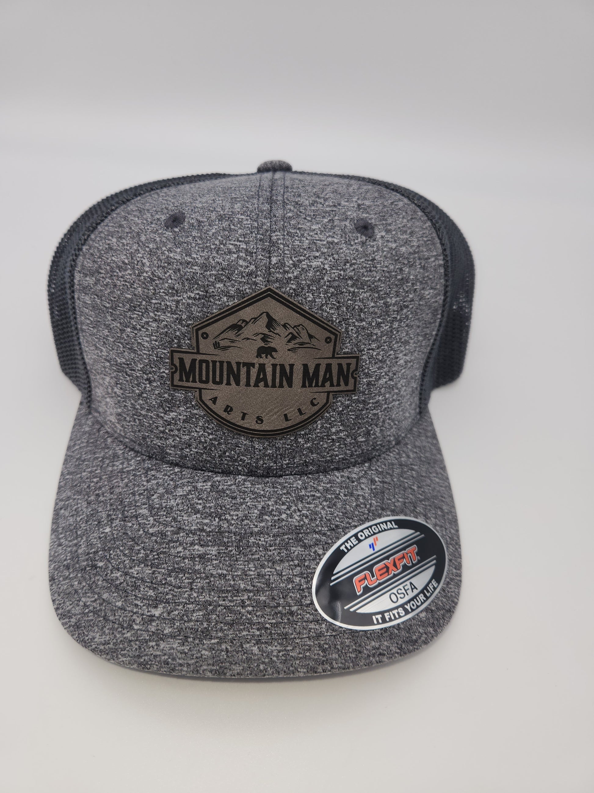 FlexFit hat with leather patch features trucker back and Heather gray front.